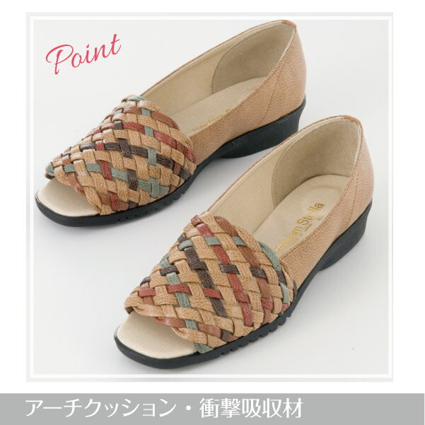 甲部分は動きの良い太さのベルトを編み上げたフレキシブルメッシュ仕様!様々な足の形にもやさしくフィット! ローヒール&軽量設計で歩きやすさも抜群!長時間のお出掛けにも疲れ知らず! ゆったり履きやすい3Eワイズタイプ!日本製品で安心な品質です。